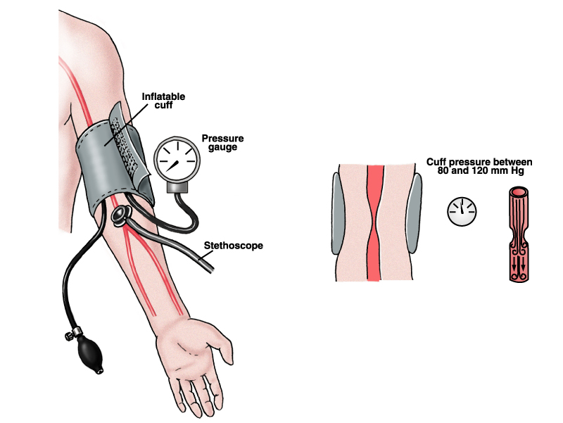 目前临床上广泛应用的是袖带加压法,采用血压计测量。血压计有水银柱式、表式和电子血压计,以水银柱式最常用。袖带加压法测量血压的基本原理:充气袖带从肢体外部压迫动脉,当施加的压力超过了心脏收缩期动脉内的压力(收缩压),则动脉内血流被完全阻断,被压迫动脉的远端就听不到声音。随后放气以降低袖带内的压力,袖带内压力刚好等于或者略小于收缩压时,心脏收缩期动脉血流得以通过,被压动脉的远端形成湍流则可听到声音,亦可触到脉搏,此时压力计上的读数即代表动脉的收缩压。当袖带内的空气压力继续下降,袖带内压力刚好略小于舒张压时,动脉内血液成为连续平静的血流,声音消失或声调突然改变,此时压力计上的读数即代表动脉的舒张压。