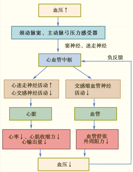 动脉血压保持相对稳定对于维持机体的正常生命活动具有十分重要的意义。正常的血压是器官、组织和细胞得到充足血液供应的保证。血压低则机体各器官供血不足,难以满足其代谢的需要而发生功能障碍;血压过高,心脏的后负荷过重,久之可引起心脏扩大,甚至心力衰竭。此外,血压过高还能促进动脉硬化、血管壁受损甚至破裂,如脑血管受损破裂可发生脑溢血。尽管许多反射活动都参与血压的稳定性调节,但以颈动脉窦和主动脉弓压力感受器参与的降压反射最为重要。