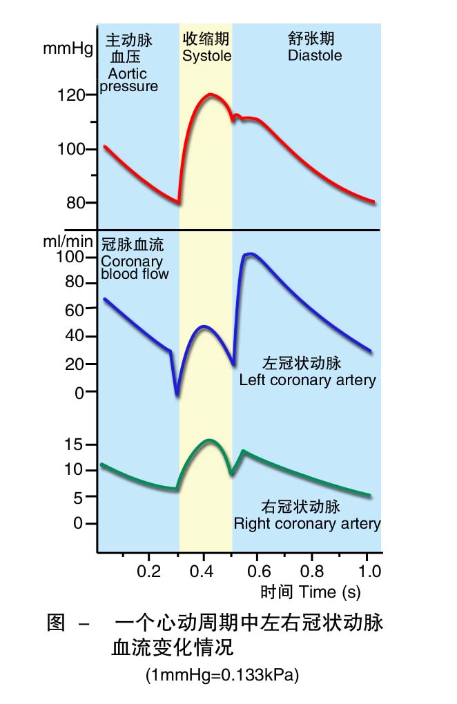总之,在整个心动周期中,心舒期冠脉血流量大于心缩期。因此,舒张压的高低和舒张期的长短对冠脉血流量的影响很大。在其他条件不变的情况下,任何使舒张压降低或舒张期缩短的因素都会使冠脉血流量减少。
