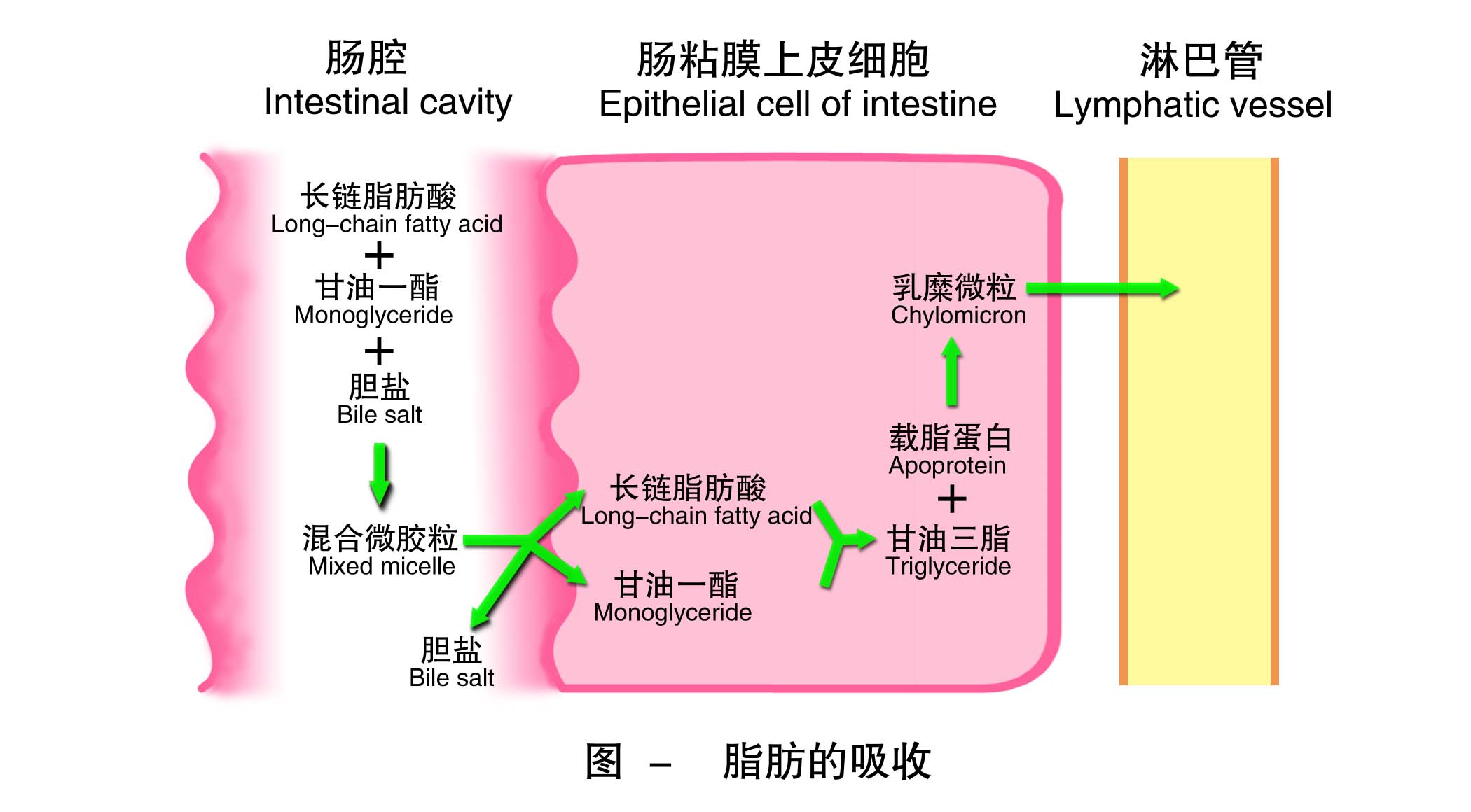 脂肪在小肠内被消化为甘油、脂肪酸和甘油一酯后,很快与胆盐形成混合微胶粒,进入小肠粘膜细胞内。长链脂肪酸及甘油一酯在肠上皮细胞内被重新合成为甘油三酯,并与细胞中的载脂蛋白形成乳糜微粒,进入毛细淋巴管。中、短链脂肪酸和含中、短链脂肪酸的甘油一酯是水溶性的,可直接经毛细血管进入血液。由于膳食中长链脂肪酸很多,所以脂肪的吸收途径仍以淋巴为主。