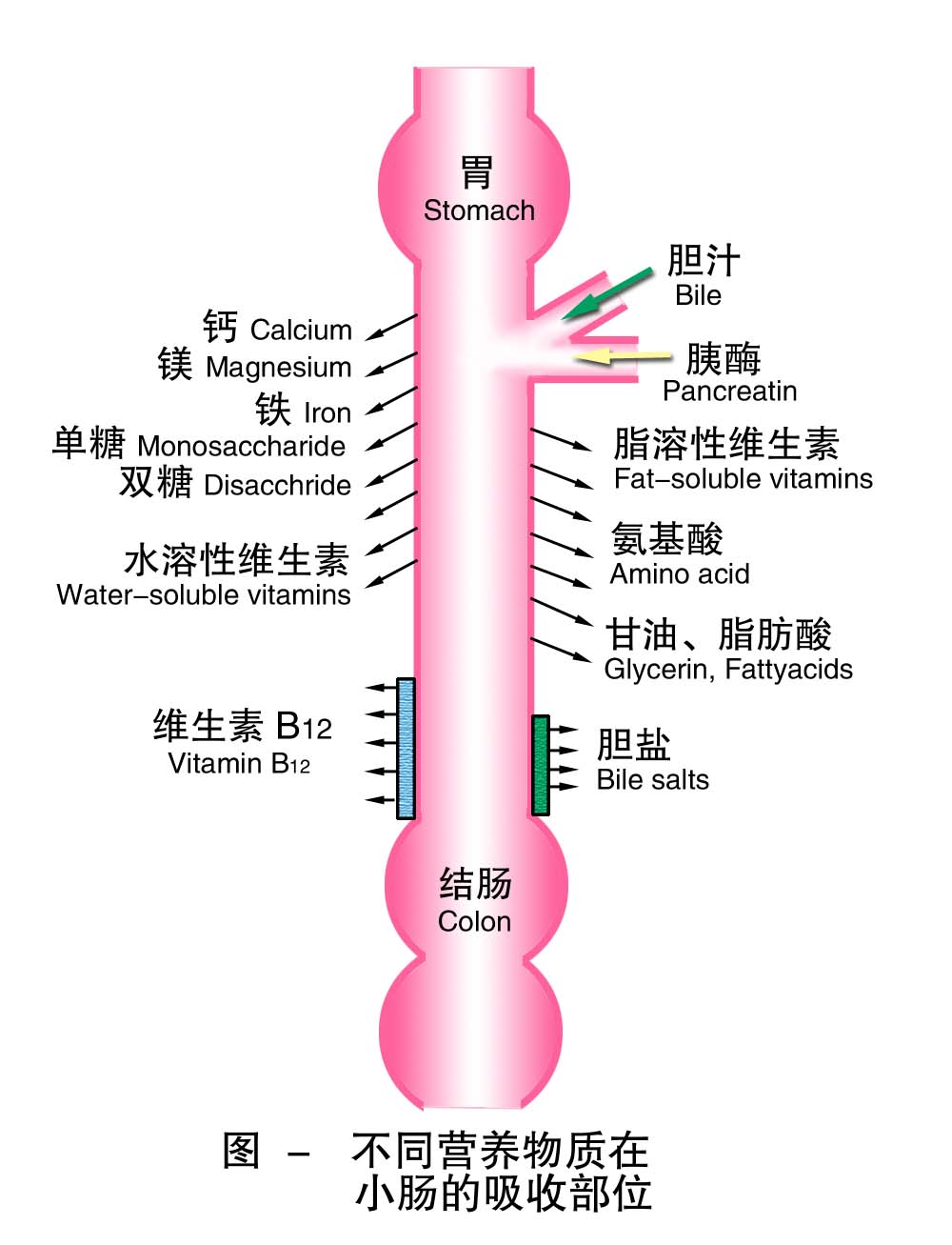 人体每日由胃肠吸收的液体量约8L。水的吸收都是被动的,各种溶质被吸收所产生的渗透梯度是水分吸收的动力。钠的吸收属于主动转运。铁的吸收也是主动过程。食物中的铁绝大部分为高价铁,不易被吸收,需还原为亚铁才能被吸收。通常食物中的钙只有一小部分被主动吸收。脂溶性维生素A、D、E、K的吸收机制与脂肪吸收相似。水溶性维生素主要以扩散的方式在小肠上段被吸收,维生素B12与内因子结合后在回肠被吸收。
