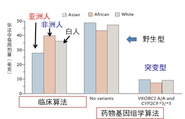 图2、基于药物基因组学的华法林预测剂量与基于临床因素的华法林预测剂量在人种间的差异比较[1]