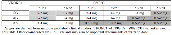 美国FDA对华法林用药的建议:在使用华法林治疗前,需要对病人CYP2C9及VKORC1基因型进行测定,并根据基因型确定给药剂量。为了更好地指导临床个体化给药,美国FDA制订了基于基因多态性检测结果的用药建议,FDA批准的药品说明书中基因型与华法林用药剂量的关系如表所示,即当VKORC1基因型为GG、CYP2C9为*1/*1时,华法林的用药剂量为5-7mg,而当VKORC1为AA型,CYP2C9为*3/*3时,用药剂量应减少到0.5-2mg。