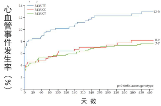 ABCB1 基因位于人类7 号染色体q21.1,其cDNA 全长4669 bp,由28 个外显子组成,转录可得到4.5 kb 的mRNA,编码一个170 kDa 的跨膜糖蛋白-糖蛋白。P 糖蛋白是一种重要的转运蛋白,氯吡格雷是P 糖蛋白的作用底物之一,抑制P 糖蛋白可以影响氯吡格雷的生物学活性。研究发现在高加索人群中,ABCB1基因3435C→T 多态性与冠心病患者PCI术后的死亡、心肌梗死、卒中等心血管事件相关。如图3所示,携带ABCB1基因3435 TT 型的个体发生死亡、心肌梗死、卒中的风险为12.9%,而携带CT和CC 型个体死亡、心肌梗死、卒中发生的风险分别为8.2%和7.7%。所以,ABCB1基因3435 TT 型是氯吡格雷抵抗的高风险基因型。