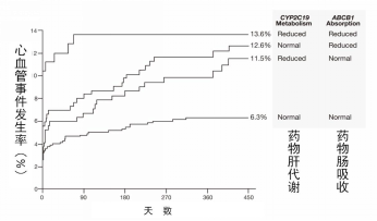 由于氯吡格雷在体内需要经过肠内的吸收和肝脏的代谢才能发挥其抗血小板作用,应该将氯吡格雷的肠吸收和肝代谢酶的多态性综合考虑。如图4所示,当CYP2C19基因为突变型和ABCB1基因为3435 TT时,心血管不良事件发生率为13.6%;当CYP2C19基因为野生型、ABCB1基因为3435 TT(酶活下降)时,心血管不良事件发生率下降到12.6%;当CYP2C19基因为突变型、ABCB1基因为3435 CC(酶活正常)时,心血管不良事件发生率下降到11.5%;而当CYP2C19基因为野生型、ABCB1基因为3435 CC(酶活正常)时,心血管不良事件发生率仅有6.3%。