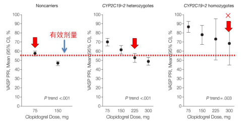 2010年3月12日,美国食品药品监督管理局(FDA)在氯吡格雷的药物说明书中增加了应对代谢不良者进行基因检测的“黑框警告”:氯吡格雷代谢不良者,其在体内不能有效地转化为发挥药物作用的活性形式,药物疗效因而显著降低,提醒临床医生应对编码细胞色素P450的CYP2C19基因进行检测,再根据此项检查来判断患者CYP2C19的功能,如属于氯吡格雷代谢不良者,医生应考虑增加氯吡格雷的剂量或改用其他抗血小板药物。在JAMA上有一篇里程碑式的研究表明(如图2所示),对野生型CYP2C19的患者来说,服用75 mg的氯吡格雷就可以达到有效的药物浓度;而对于杂合型的患者来说,服用225 mg的氯吡格雷才可以达到有效的药物浓度;但对于纯突变型的患者来说,即使服用300 mg的氯吡格雷也达不到有效的治疗效果。