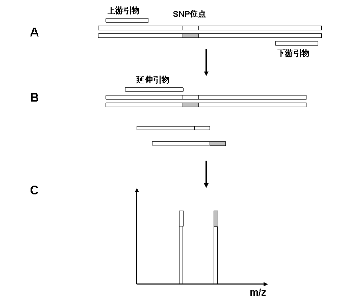 A.PCR扩增 B. 引物延伸反应 延伸引物设计在紧挨多态性位点的上游 C. MALDI-TOF质谱检测延伸反应的产物