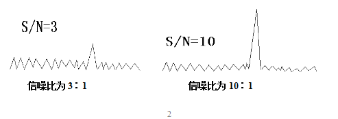 2.信噪比法 对能显示基线噪音的仪器分析方法,可将已知低浓度的被测组分溶液与空白样品的测定结果进行比较,按信(号)噪(音)比确定可被检出的最低浓度。一般以信噪比为3∶1或2∶1时相应的浓度或注入仪器的量确定检测限。