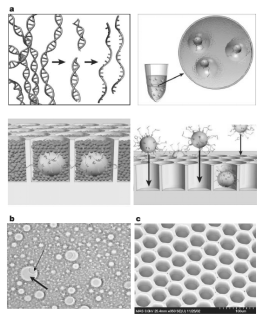 图1a. 基因组DNA经过提取分离得到后,被打碎成小片段,再在片段两端连接接头,并把双链解开成单链(左上)。片段化的单链DNA与磁珠和乳液按照一定的比例混合,经过搅拌形成体积为皮升级油包水的小乳滴,理想状态下乳滴中将只含有一个DNA分子和一个磁珠。油包水的反应体系经过PCR扩增和破乳并制单链后,得到表面连接有数百个DNA分子的磁珠(右上)。将磁珠放于光导纤维蚀刻板的孔洞中(右下),加入焦磷酸测序反应液开始测序(左下)。b.油包水乳滴在显微镜下拍照得到的图片显示,部分乳滴中含有一个磁珠,另一部分没有包含磁珠。c.光导纤维蚀刻板的电子扫描显微镜扫描结果。