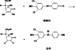 2,6-二氯靛酚为一染料,其氧化型在酸性介质中为玫瑰红色,在碱性介质中为蓝色。与维生素C作用后生成还原型的无色酚亚胺,从而使颜色消失。
