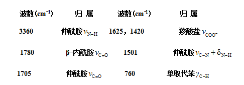 2.红外光谱法 《中国药典》中青霉素钠和青霉素钾均采用红外分光光度法进行鉴别,用溴化钾压片后测定,要求供试品的红外吸收光谱与对照的图谱一致。青霉素钠的主要特征峰如下: