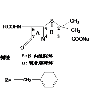 青霉素类药物的结构由母核和侧链两部分组成。母核为6-氨基青霉烷酸,由β-内酰胺环和氢化噻唑环并合而成,C3上有一个羧基。不同的侧链构成不同的药物。青霉素钠(钾)的侧链为苄基,母核上的羧基形成钠盐为青霉素钠,形成钾盐即为青霉素钾。