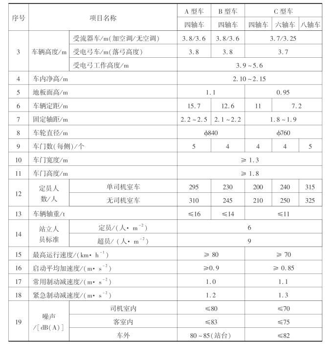 注:①车辆详细技术条件,可参照《地铁车辆通用技术条件》(GB7928-2003)和《轻轨交通车辆通用技术条件》(CJ/T 5021-95)。