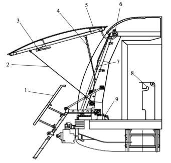 1-门梯;2-卷收带;3-门锁;4-空气弹簧;5-门扇;6-铰链; 7-密封骨架;8-防护罩;9-门梯固定装置