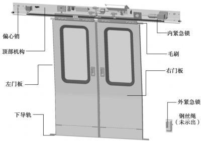 1-右门页;2-左门页;3-导轨;4-锁钩/紧急手柄;5-左门驱动连杆;6-驱动风机; 7-解锁风缸;8-中央控制阀;9-导向衬块;10-橡胶密封条;11-防跳轮/支撑滚轮;