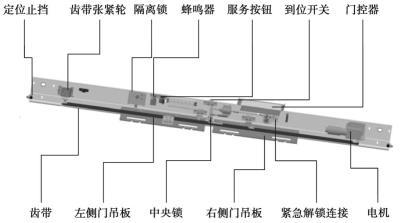 ①内藏嵌入式移门。内藏嵌入式移门简称内藏门,在车门开/关时,门页在车辆侧墙的外墙板与内饰板之间的夹层里移动。传动机构设于车厢内侧车门的顶部,装有导轨的门页可在导轨上移动。双扇电动内藏门的驱动机构组成包括机械控制及电气控制两部分。机械控制部分由传动导向装置、内外侧紧急解锁装置、故障隔离锁等设备共同组成。电气控制部分由门控器、驱动电机及实现自动门功能的其他附件构成传动导向装置。传动导向装置由安装底板、门扇吊挂部件、传动装置、中央锁等部件组成。客室门主要零部件如图4.1所示,客室门顶部机构如图4.2所示。