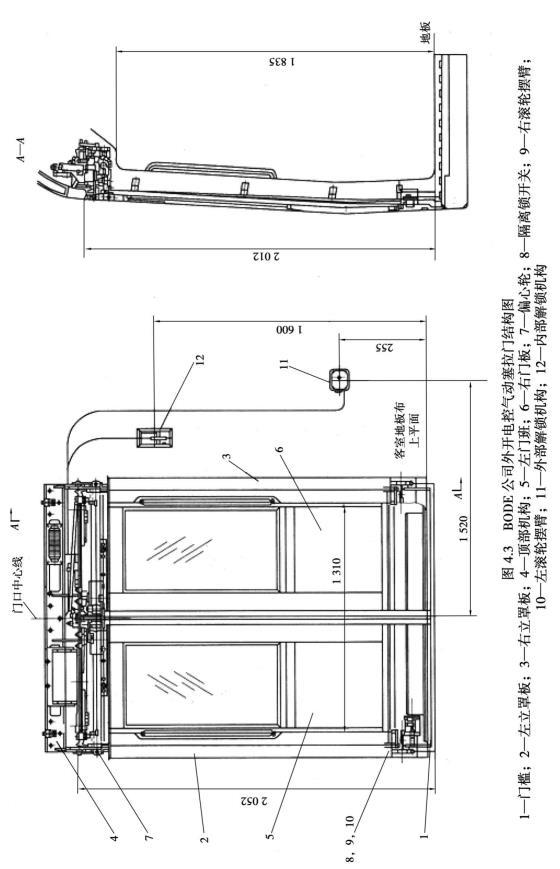 以广州地铁1号线车辆客室车门为例,车门系统主要由电气控制系统、空气驱动系统、机械传动系统、门机械锁闭机构、门页、导轨、紧急解锁机构、门状态检测及信号指示等组成。其结构如图4.10所示。