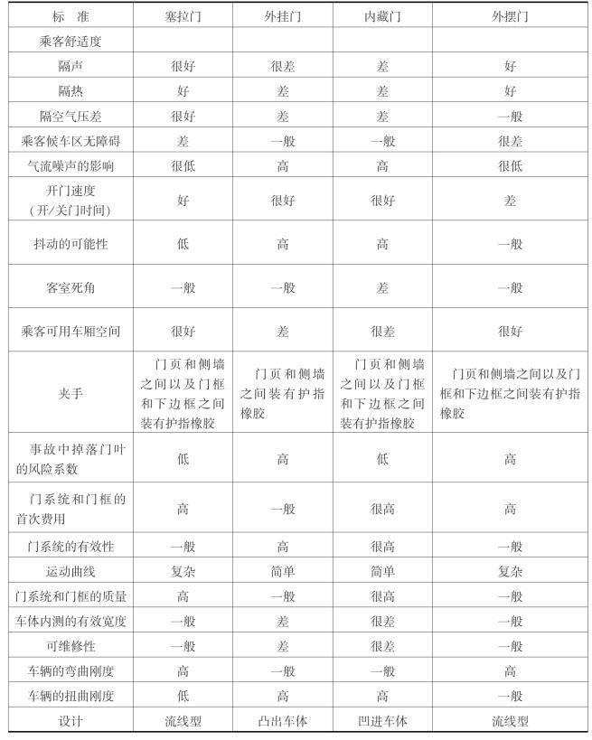 B.性能要求。城轨车辆塞拉门的各种特性比较见表4.1.