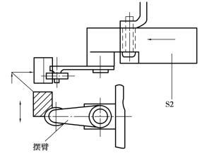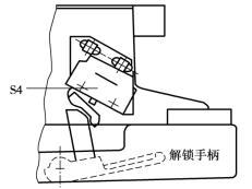 d.门解锁行程开关S4.该行程开关安装在车门控制机构中央的紧急开门手柄上方,由紧急开门手柄上的凸轮操纵。其组成结构如图4.16所示。紧急情况下拉下紧急解锁手柄后,S4的触点断开,使中央控制阀的MV2电磁阀失电,驱动风缸左腔的压力空气排往大气,这时可通过双手把门页打开。