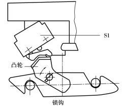 a.锁闭行程开关S1.该行程开关用于检测车门是否正确锁闭。其组成结构如图4.13所示。S1位于车门控制机构的中央,从车内观察,该开关位于紧急开门手柄的后面,通过锁钩上的凸轮操纵。当车门锁钩被顶开时,凸轮旋转使S1动作。
