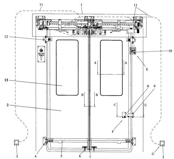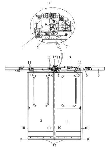 1-右门页;2-左门页;3-导轨;4-锁钩/紧急手柄;5-左门驱动连杆;6-驱动风机; 7-解锁风缸;8-中央控制阀;9-导向衬块;10-橡胶密封条;11-防跳轮/支撑滚轮;