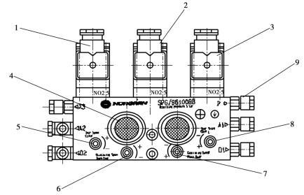 5-关门速度节流阀;6-开门缓冲节流阀;7-关门缓冲节流阀;8-开门速度节流阀;9-气路连接头