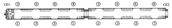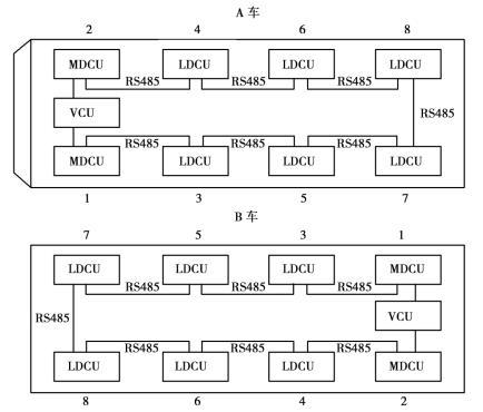 每个客室门均由一个独立的EDCU控制。客室门1和2的EDCU配有主控卡。通过多功能车辆纵向(MVB)实现与其他车厢的信息交换。其中一个带有主控卡的EDCU(MDCU)用来执行与VCU的通信任务。另一个MDCU则作为主控冗余,在前一个MDCU出现故障的情况下接管主控功能。其他客室门(3~8)则由不带主控卡的本地控制单元(LDCU)控制,可通过一个RS485接口与MDCU进行单独通信。
