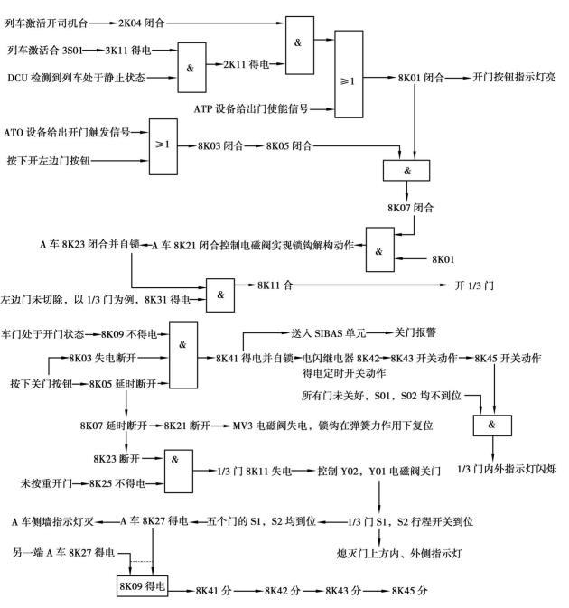 A.开关门控制电路。当满足司机台激活、列车速度为“0”、ATP系统给出门使能信号后,按下“开门”按钮,经过整列车、单节车、单个门的相关继电器使单个门的中央控制阀控制车门打开。开车前,按下“关门”按钮,时间继电器延时结束后,中央控制阀控制(详见车门气动控制部分)使车门关闭。