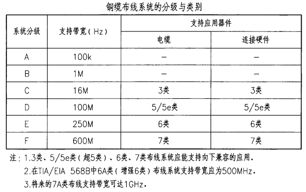 定义到100MHz,定义了使用面积达100万平方米和5万个用户的建筑和建筑群的通信布线 ,建立了“级(Classes)”,即Class A,Class B,Class C,Class D等级的概念。
