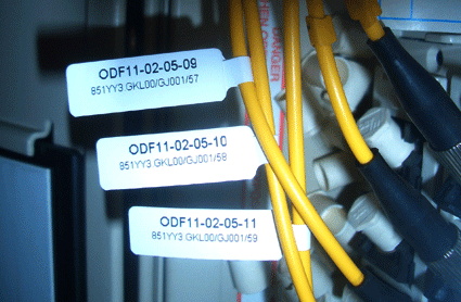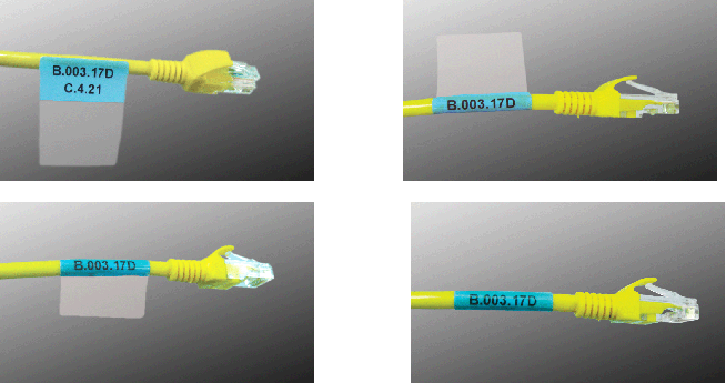 对于跳线的标识要求使用带有透明保护膜(带白色打印区域和透明尾部)的耐磨损、抗拉伸的标签材料(如乙烯基)。使用这种包裹和伸展性的材料做标签,即使缆线弯曲、变形以及经常的磨损,也不会使标签脱落和字迹模糊不清;