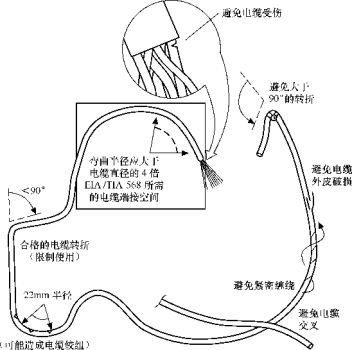 (4)线缆应有余量以适应终接、检测和变更。对绞电缆预留长度:在工作区宜为3~6cm,电信间宜为0.5~2m,设备间宜为3~5m;有特殊要求的应按设计要求预留长度。