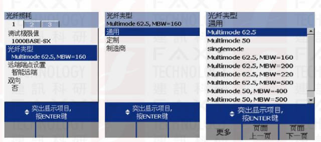 设置“光纤类型” ,DTX中光纤类型有:通用类型、定制类型、制造商类型(按所测光纤链路类型选择)