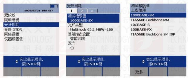 操作步骤:在“SETUP”中选择“光纤损耗”选项,然后选择“测试极限值”即测试标准(仪器内置了多种标准,例如布线安装标准,应用标准等)。