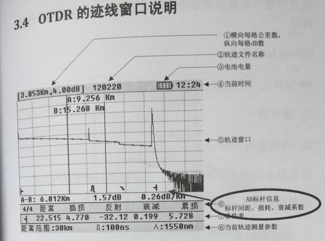 四、北讯光时域反射仪(OTDR)迹线窗口说明: