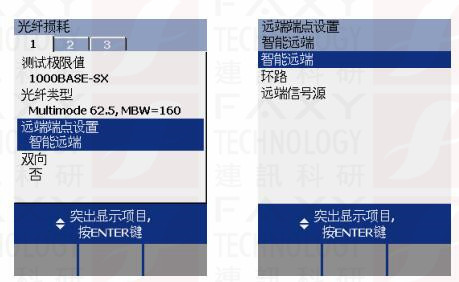 “远端端点设置”有3中方式:智能远端(用智能远端模式来测试双重光纤布线)、环路(用环回模式来测试基准测试线与光缆绕线盘)、远端信号源(用光学信号源来测试单条光纤链路)