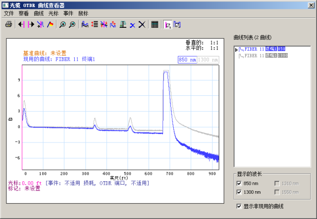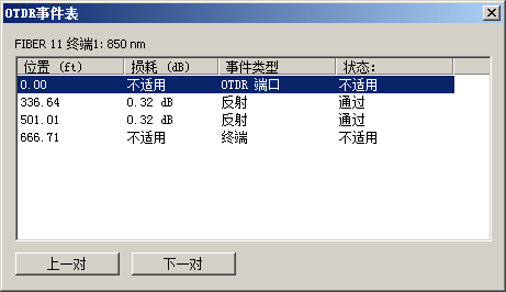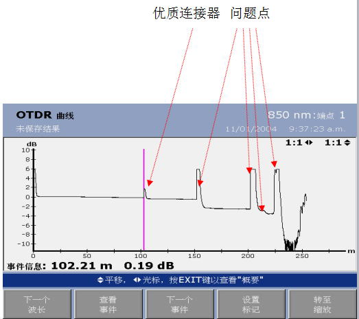 可以移动红色光标竖线精确定位,并放大观看,也可以直接按下“下一个事件”按键报告结果,还可以直接查看事件列表(按下“事件查看”)结果,适合初学者。欲观察首尾连接器质量则必须加上(首尾)补偿光纤。