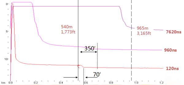 不同的脉宽在接头处会产生不同长度的拖尾。对于不同的脉宽,拖尾长度亦有不同,下图例中960ns脉宽时的拖尾淹没了第二个接头。机械接头在同样脉宽下的拖尾将大于熔接接头。拖尾即是我们通常所说的事件盲区。