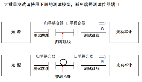 在工程测试中,先将测试跳线用光耦合器短接测量Po,测量然后移去光耦合器,将测试跳线接入被测光纤链路测量Pi。