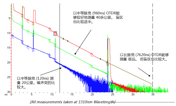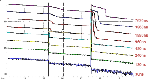 脉冲宽度 与盲区和动态范围直接相关。在下图中,用8个不同的脉冲宽度测量同一根光纤。最短的脉宽获得了最小的盲区,但同时也导致了最大的噪声。最长的脉宽获得了最光滑的测试曲线,与此同时,盲区长达接近1公里。