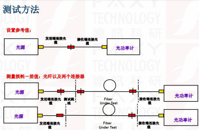 测试方法是指所含端点连接数(连接器数)。方法A:损耗结果包含光纤和一端的连接器。方法B:损耗结果包含光纤和两端的连接器。方法C:损耗结果不包含链路两端的连接器,仅测量光纤损耗。