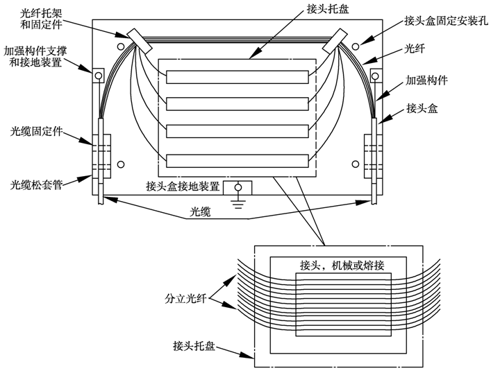 (1)在楼内敷设光缆时可以不采用钢丝绳,如果沿垂直金属槽敷设,则只需在光缆路径上每两层楼或10 m用缆夹吊住即可。