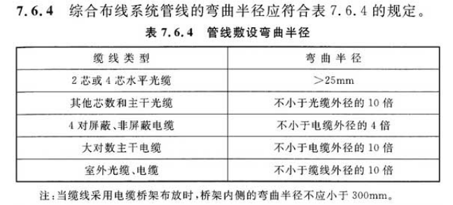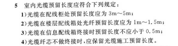 (6)光缆布放应有冗余。光缆布放路由宜盘留(过线井处),预留长度宜为3 m~5 m;在设备间和电信间,多余光缆盘成圆来存放,光缆盘的弯曲半径也应至少为光缆外径的10倍,预留长度宜为3 m~5 m,有特殊要求的应按设计要求预留长度。