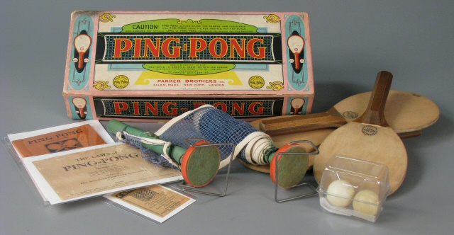 相比不甚明晰的起源,乒乓球运动的正式出现比赛还是要归功于赛璐璐材质乒乓球的出现( James W. Gibb,1901年),对比反弹多变的牛皮球和弹不起来的硬木球,使用赛璐璐制作的乒乓球最终促进了乒乓球运动的发展和普及,由于空心牛皮球与球撞击发出“乒”而落台时发出“乓”的声音,故而又称“乒乓球”。詹姆斯注册了“乒乓”这个品牌并限制其它公司使用,所以市面上出现了两种乒乓球名称——table tennis和ping pong。特别在美国,由于美国人接触的都是ping-pong品牌,所以美国人一般都把乒乓球称为ping-pong。