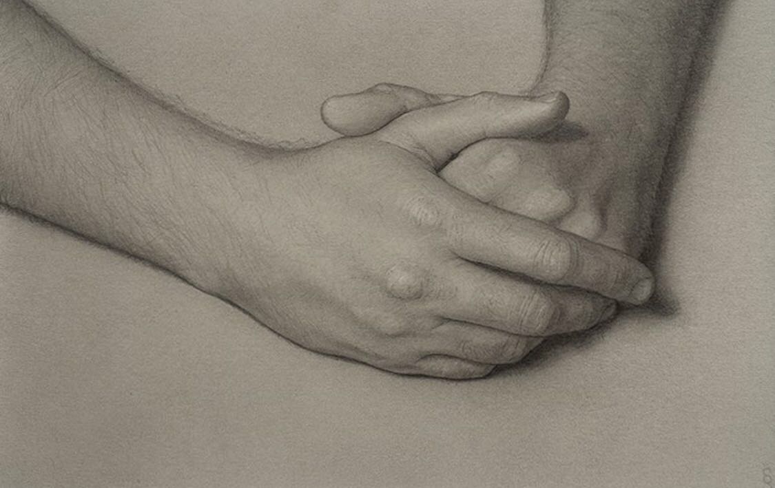 要画好手的形象,应该从认识手的一般造型特征和运动规律入手。手的形象由手腕、手掌和五指组成。手腕是个非常灵活的关节,手的动态取决于手腕的运动。手腕的造型受桡骨和尺骨下端的影响较大。手的形象和动态又与手掌和手指各关节的动态变化密切相关。要确定手腕、手掌的基本造型,然后确定手指各关节的位置,包括各手指端点、各中间关节的位置和体现的联线趋势,最后再画出各个手指的具体形象轮廓。需要注意的是画手的形象时忽略于小的存在和形象,把手掌直接和下臂联在一起画;画手指时不顾五指造型的联系孤立地画出,往往把五指画得一样粗细一样长短,甚至把手指的数目画错。