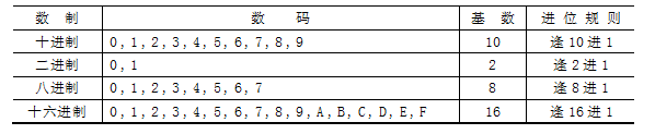 用一组固定的符号和统一的规则来表示数的方法,也称为数制。计算机中有十进制数、二进制数、八进制数和十六进制数。