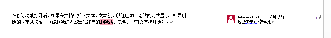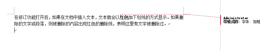 在修订功能打开后,如果在文档中插入文本,文本就会以红色加下划线的方式显示。如果删除的文字或段落,则被删除的内容出现红色的删除线,表明这里有文字被删除过。如果修改文字的格式,会为修改文字添加注释框。