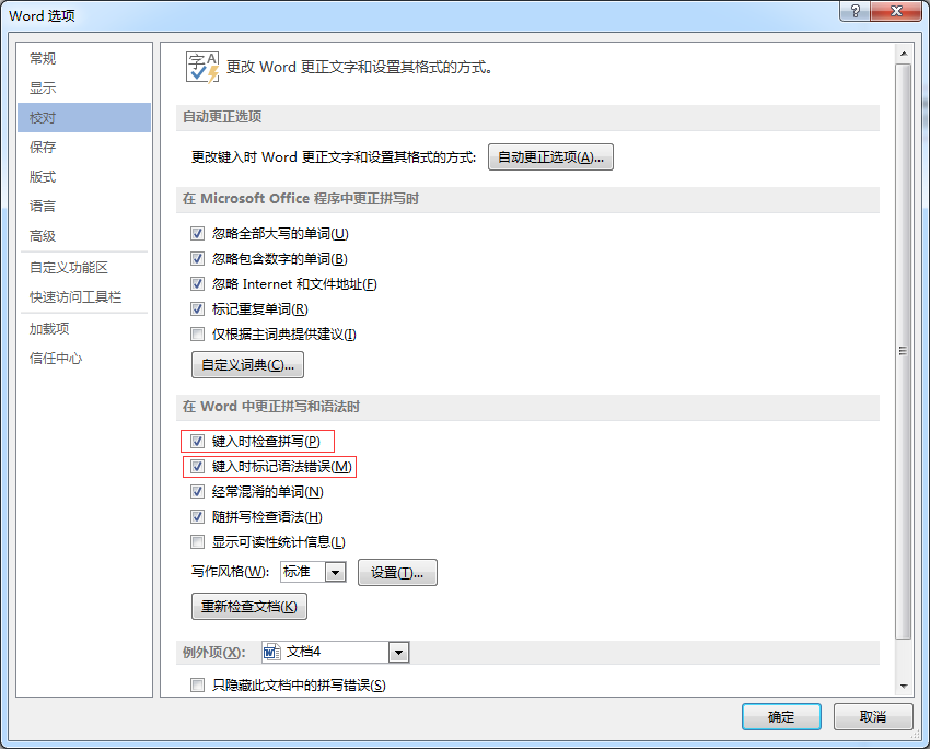 步骤2:选择“校对”选项卡,选中“键入时检查拼写”和“键入时标记语法错误”复选框,然后单击“确定”按钮,启用自动检查拼写和语法功能。