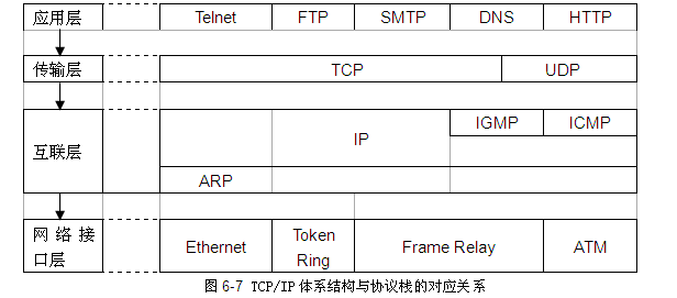 TCP/IP体系结构与TCP/IP协议栈之间的对应关系如图6-7所示: