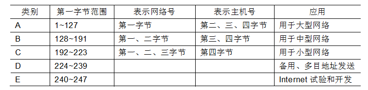 IP地址分为:A、B、C、D、E五类。常用的是A、B和C类。各类IP地址的特性如表6-1所示。