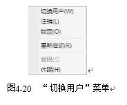 步骤2:在展开菜单中,如图4-20所示,选择“注销”命令,则关闭当前用户操作环境中的程序和窗口,返回用户登录界面;如单击“切换用户”按钮,将保存当前用户操作环境中的程序和窗口,返回用户登录界面。
